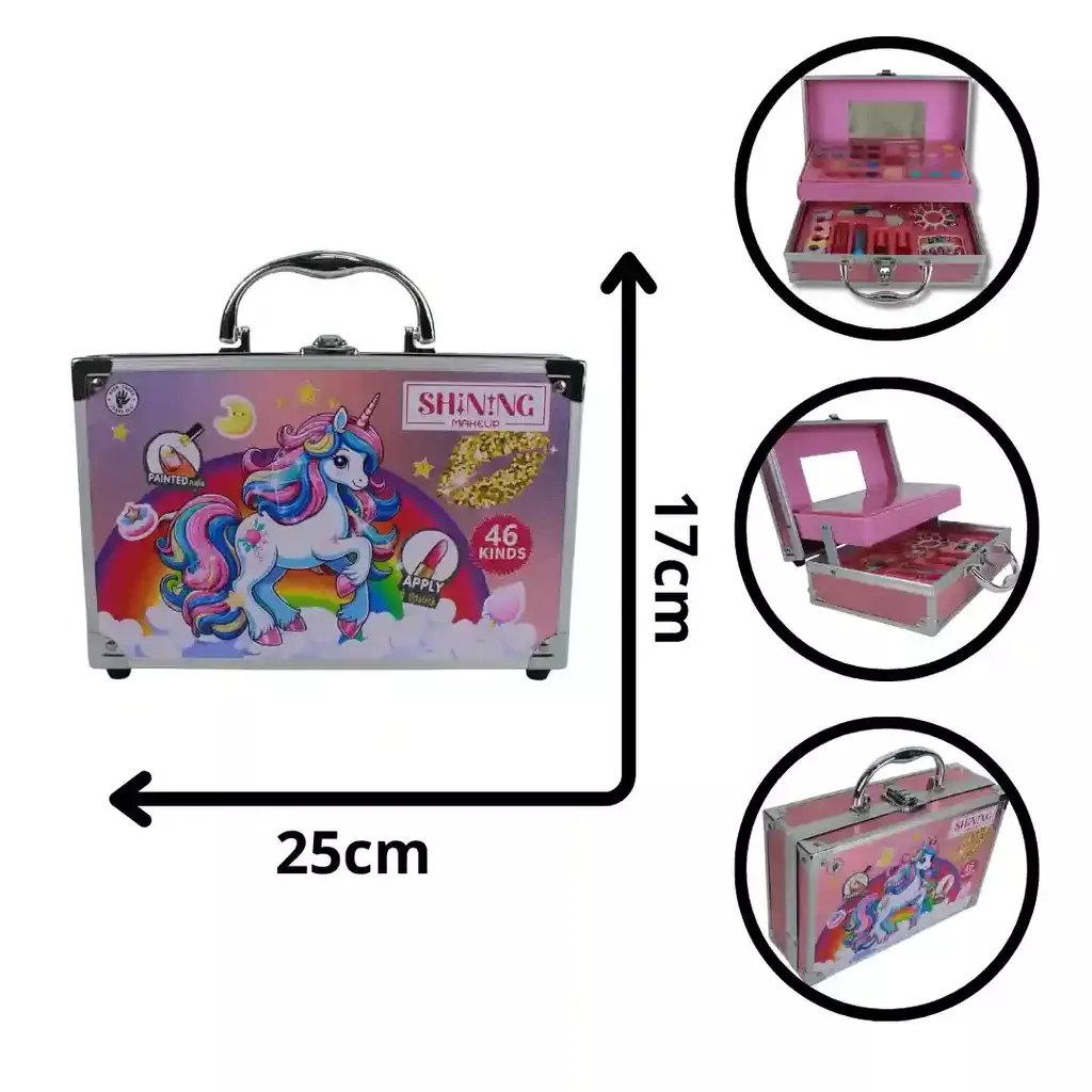 Completo set de maquillaje infantil diseñado para inspirar la creatividad y el juego. Este maletín metálico presenta un vibrante diseño de unicornio e incluye una variedad de productos seguros y coloridos para que los niños experimenten con el maquillaje de forma divertida y creativa.